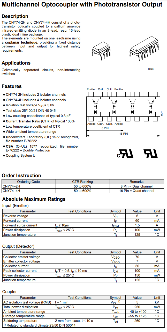 (CNY74-4H) OPTO LED-TRANS. CUADR. 2800V CTR=50/600%