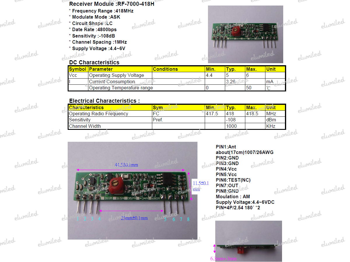 (RF7000-418B) Modulo RECEPTOR RF Trimmer 418.00 Mhz
