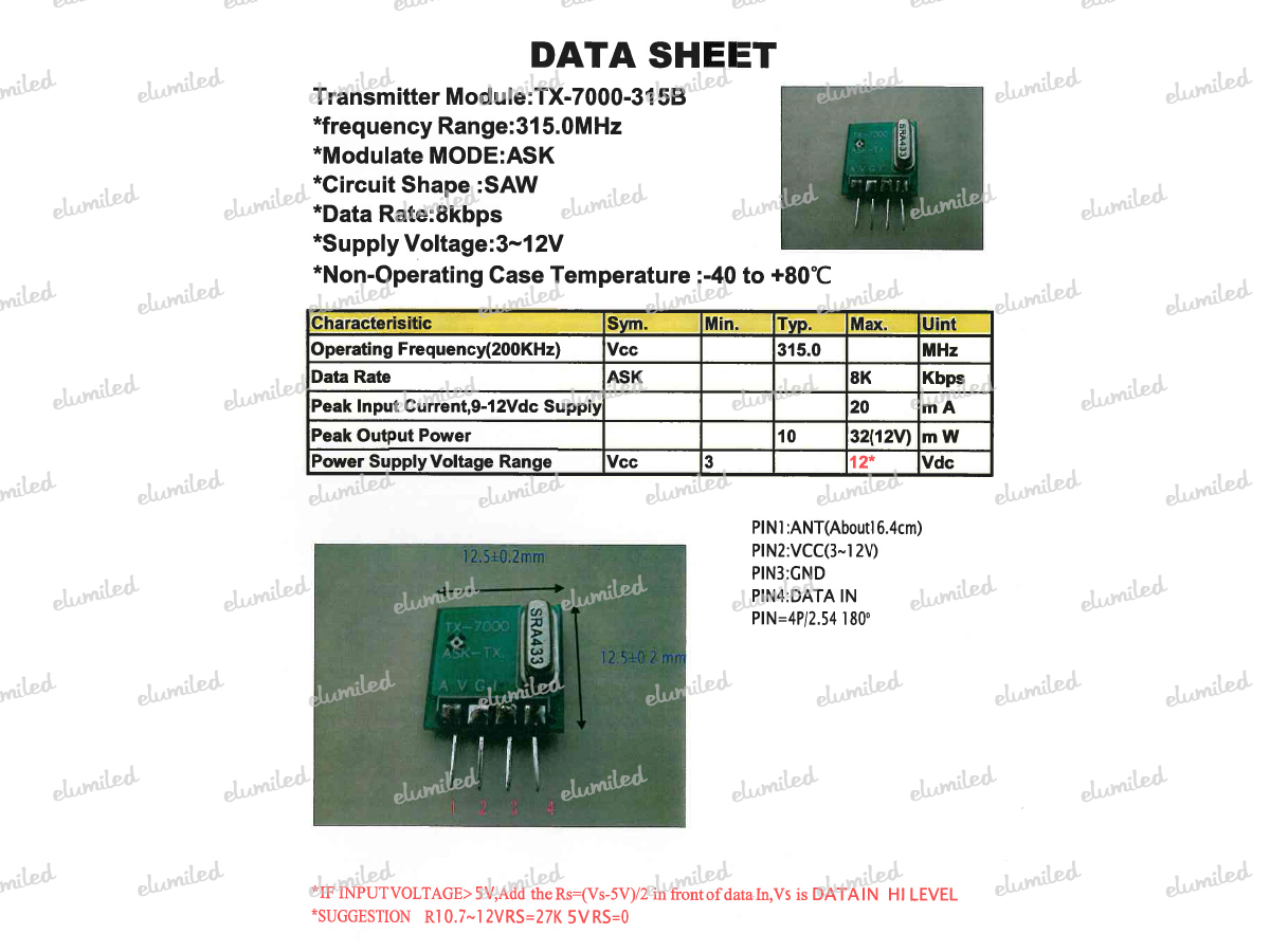 (TX7000-315B) Modulo TRANSMISOR RF SAW 315.00 Mhz
