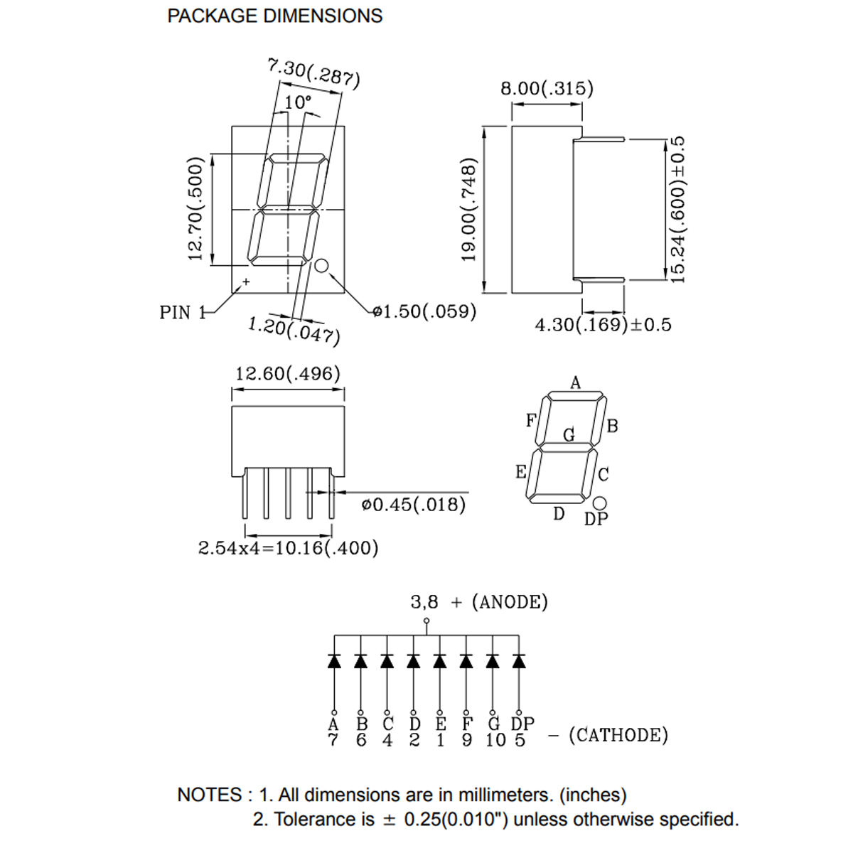 (DA501E) DISPLAY 7 Segmentos 0.5" Anodo Comun ROJO Alto Brillo 19x12.6 (12.7x7.3mm)