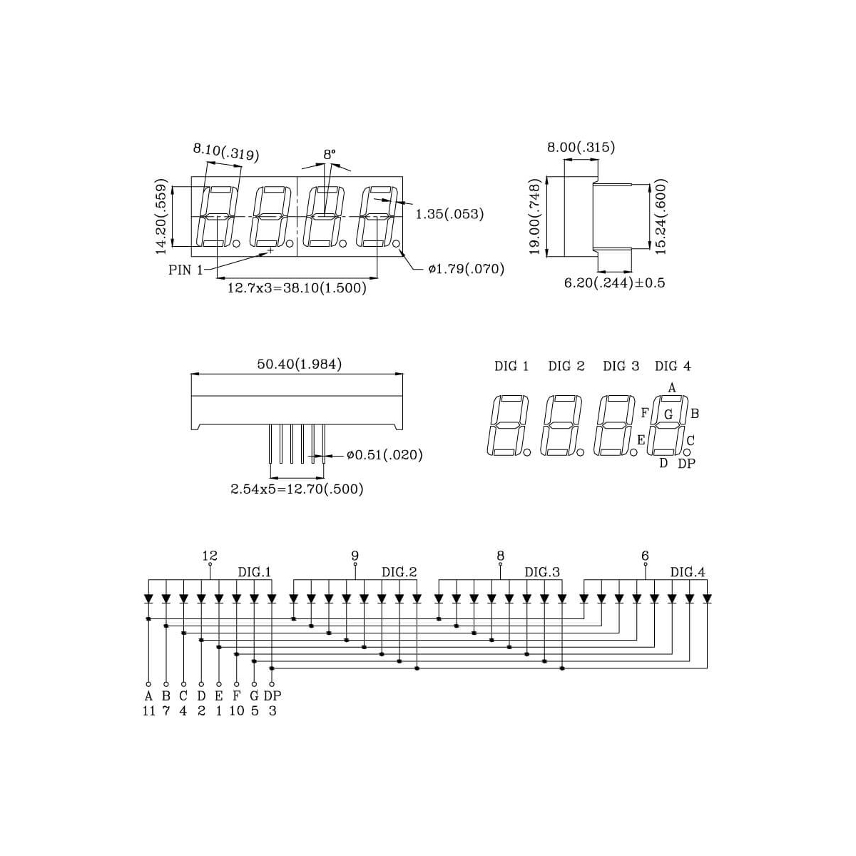 (DA564SR) Display 7 Segmentos 0.56 Anodo Comun Super Rojo (x 4 Digitos) 19x50.4 (14.2x8.1mm)
