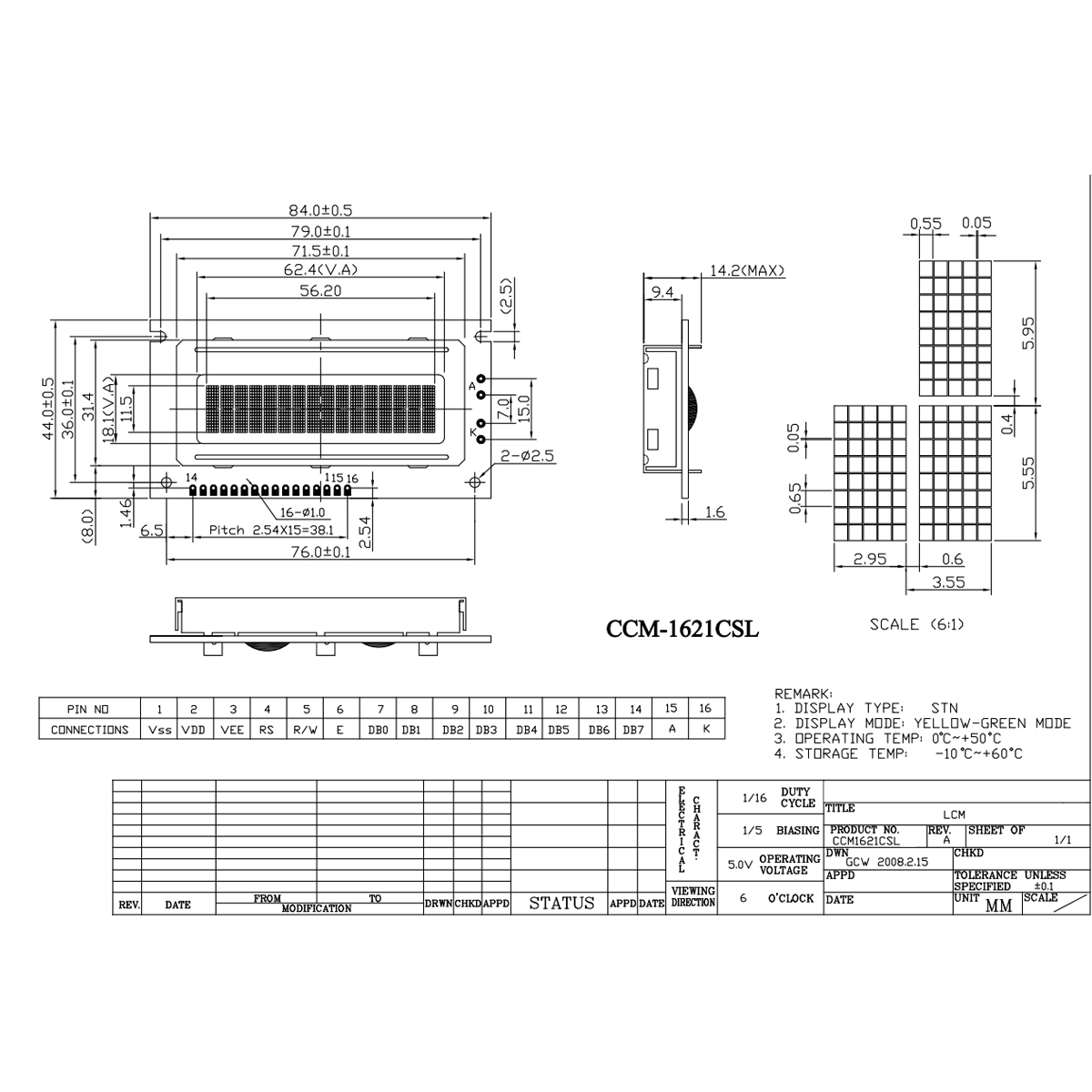 (CCM1621CSL) Display (16x2) 84 x 44.0 x 12.7mm, Led Backlight
