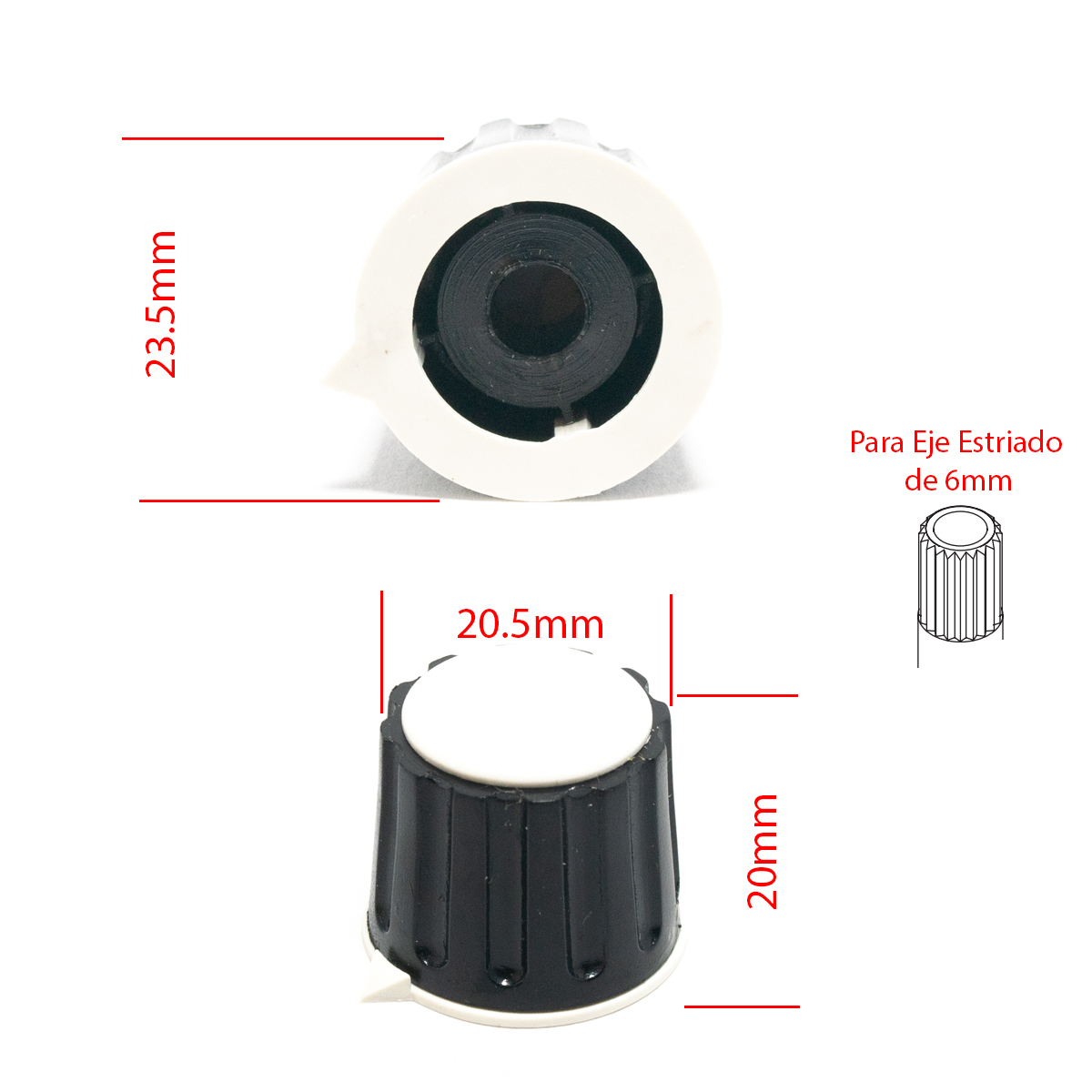 (PER-A2-B) Perilla Potenciometro (D=23 H=20) Para Eje Estriado Base/Tapa BLANCA