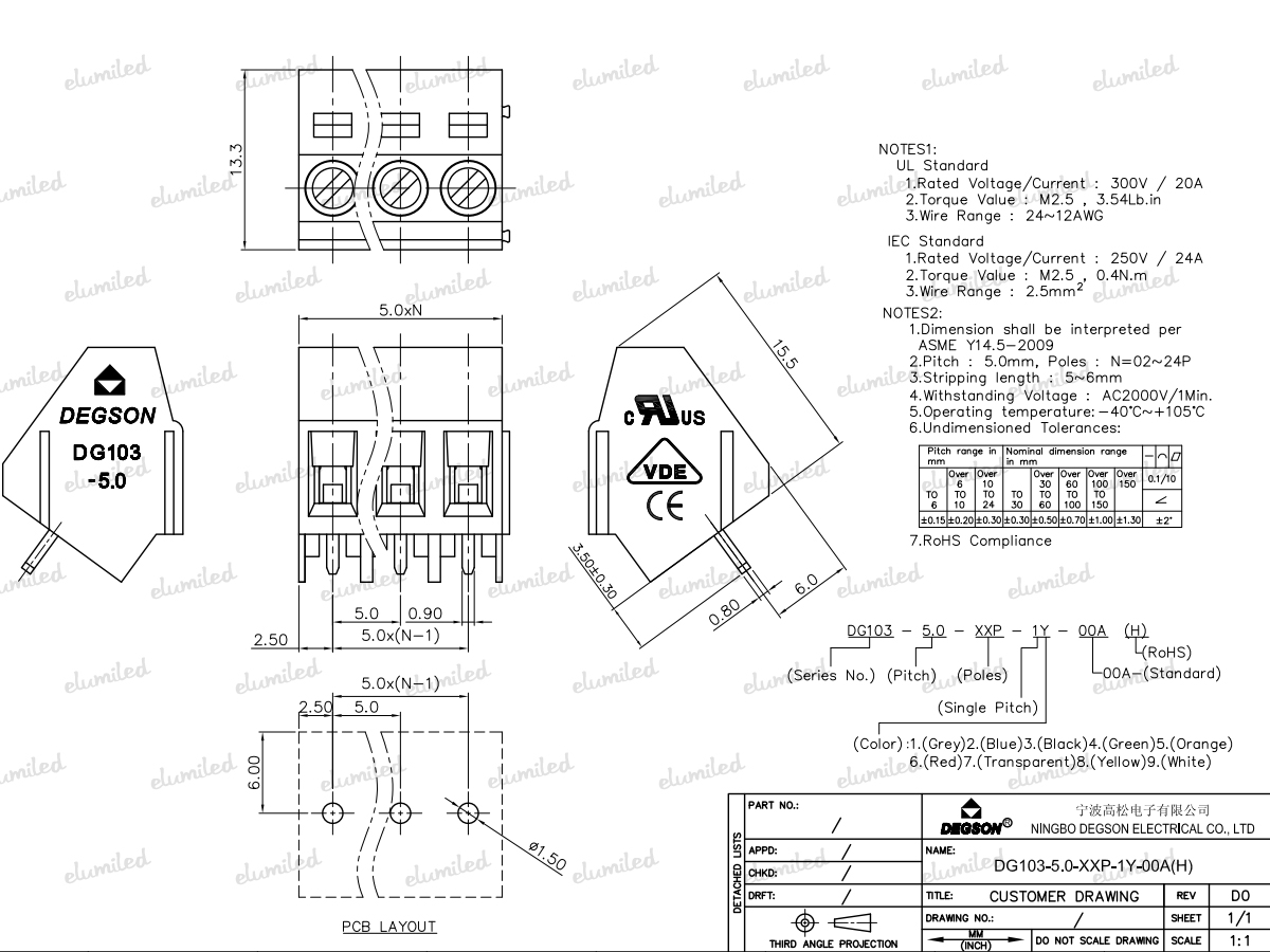 (DG103-3) Bornera 3 Polos Apilable 45 Grados 20A 300 VAC h=15.5mm AZUL Paso 5mm 24-12 AWG
