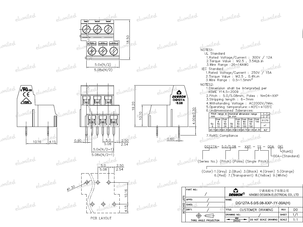 (DG127A-6) Bornera 3+3 Polos Apilable 12A 300VAC h=19.2mm AZUL Paso 5mm 26-14 AWG