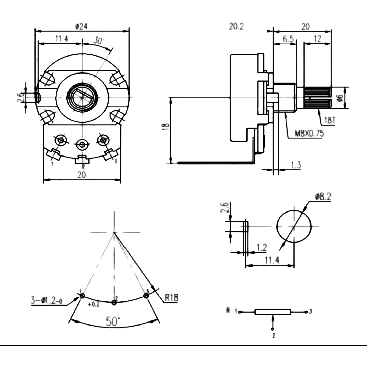 (PLIN5K-20-CI90B) Potenciometro Carbon (24mm) 5K Lineal (B) Eje L=20mm Para Circuito Impreso