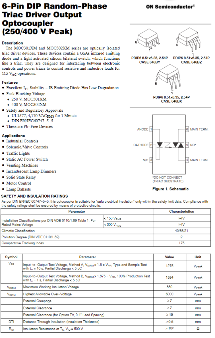 (MOC3021M-ON) OPTO TRIAC 400V, 15mA 7500V, RANDOM PHASE
