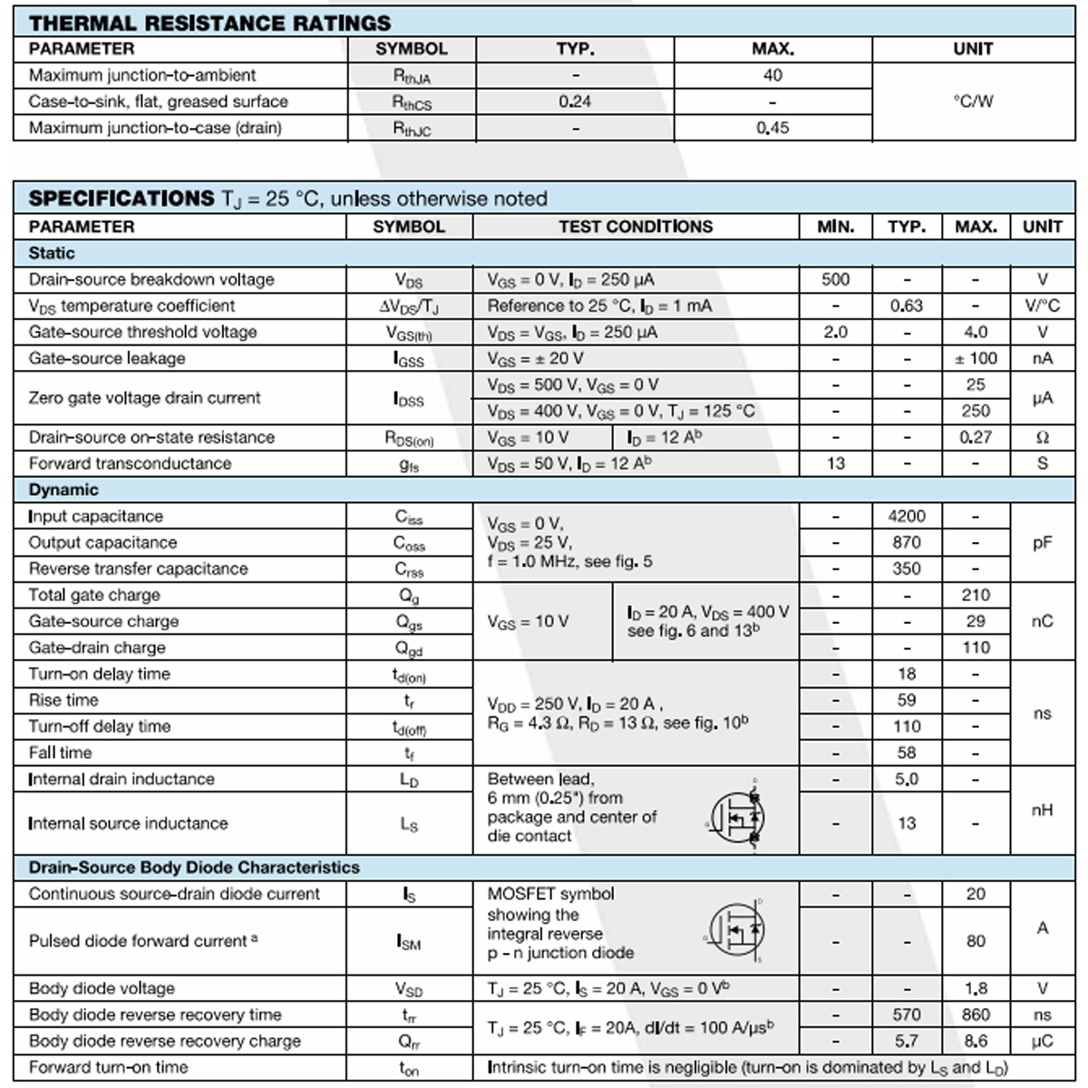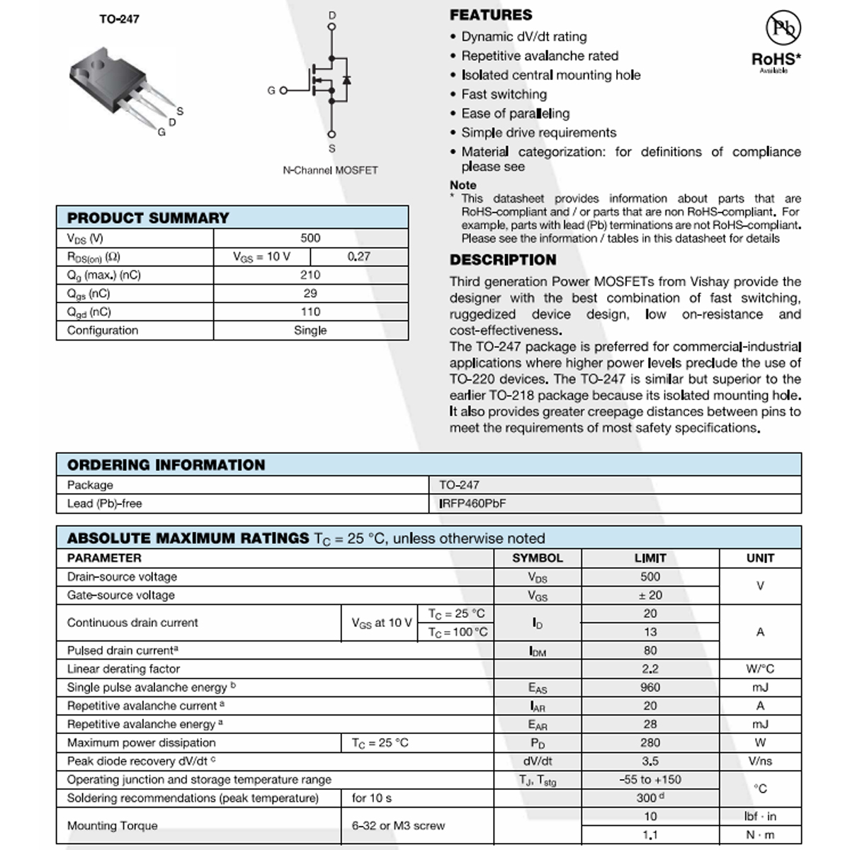 (IRFP460PBF-VHY) Transistor MOS-FET N-CH 20A 500V .27 E