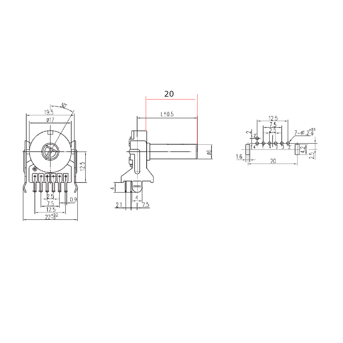 (WH0172-2-10K) Potenciometro 20mm 10K Linea 6 Pines Eje Plastico 6mm Estriado sin rosca