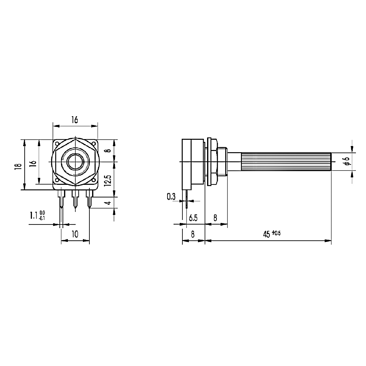 (PM-CP16-B250K) Potenciometro Lineal 250K (B) Eje Plastico Estriado 6mm 45mm Largo
